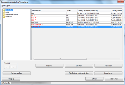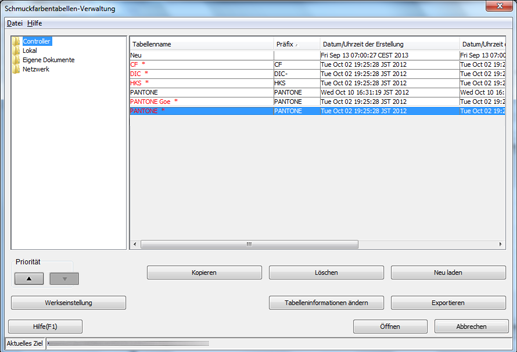 Sie können die Priorität der Tabellen im Bildschirm [Schmuckfarbentabellen-Verwaltung] ändern. Klicken Sie nach der Auswahl einer Tabelle in der Liste auf