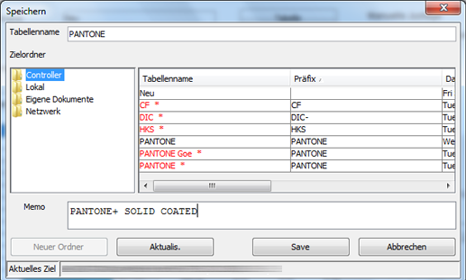 Überprüfen Sie den Schmuckfarbentabellen-Namen, wählen Sie einen [Zielordner] und klicken Sie dann auf [Speichern].