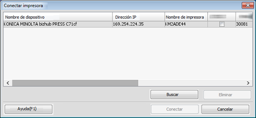 En la pantalla [Conectar impresora] puede buscar controladores de imágenes, eliminar controladores de imágenes de una lista, introducir números de puerto, autenticar conexiones y modificar la visualización de listas.