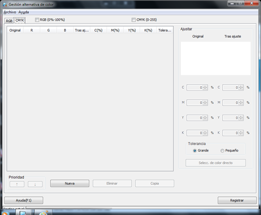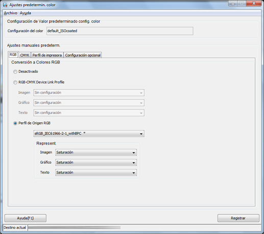 Permite administrar los ajustes de conversión de color. Para obtener instrucciones específicas, consulte Pantalla Gestión de perfil.