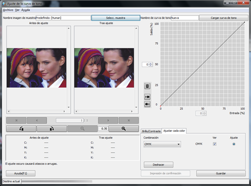 Editando curvas de tono, puede ajustar la tonalidad del color de una imagen de impresión. Para obtener instrucciones específicas, consulte Pantalla Ajuste curva de tono.