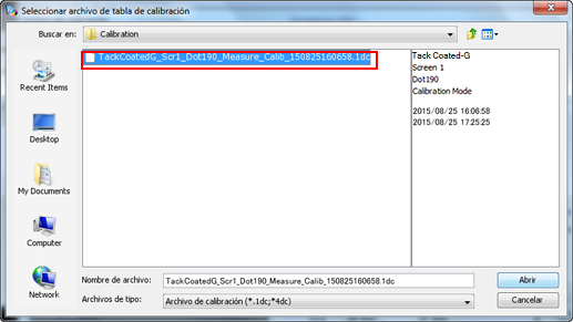 Aparece la pantalla [Seleccionar archivo de tabla de calibración].