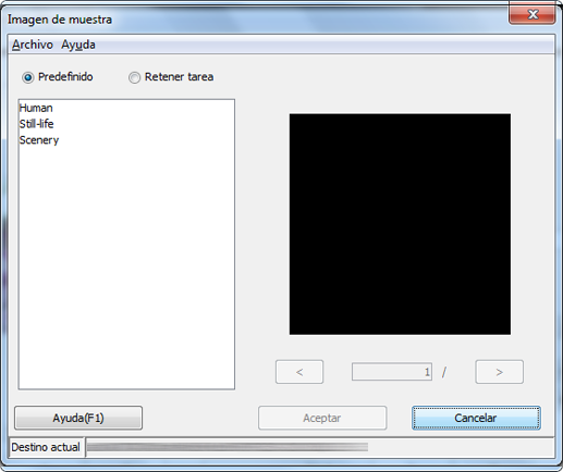 (lista) | En función de la selección de [Predefinido]/[Retener tarea], se muestra una lista de imágenes predefinidas o una lista de tareas retenidas (nombre de archivo y fecha/hora de registro) en el controlador de imagen que esté conectado en ese momento. Las tareas de impresión segura no se visualizan. |