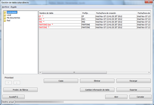La pantalla [Gestión de tabla color directo] tiene la composición siguiente: