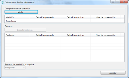 En la pantalla [Retorno de medición], puede ejecutar la operación para mejorar la precisión de la conversión CMYK-CMYK.