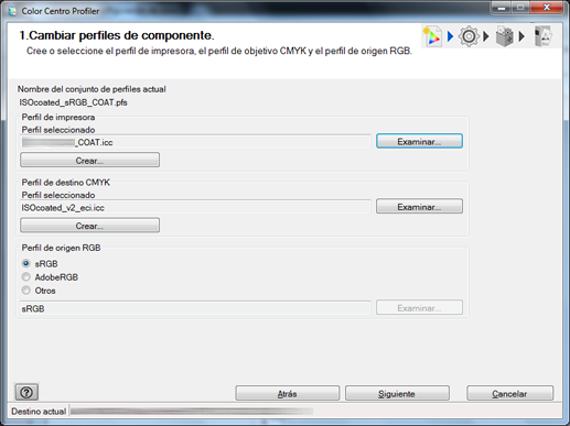 Especifique el perfil de destino CMYK utilizado por el conjunto de perfiles. Cuando utilice el perfil de destino CMYK existente, haga clic en [Examinar]. Cuando cree el nuevo perfil de destino CMYK, haga clic en [Crear].