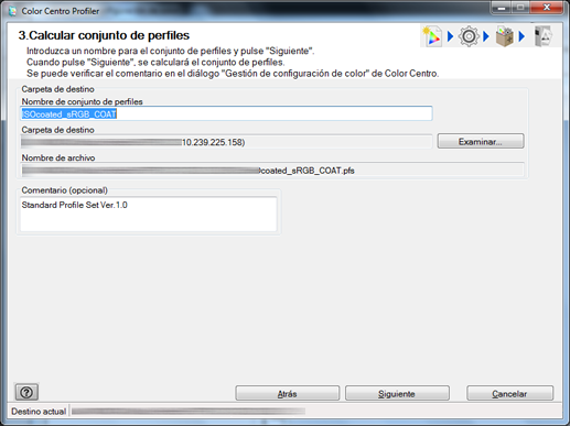 En el comentario, introduzca, si es necesario, un comentario que se va a incrustar en el conjunto de perfiles que cree. Puede confirmar el comentario cuando seleccione el conjunto de perfiles en Color Centro Profiler.
