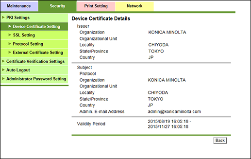 Haga clic en [Configuración PKI] - [Configuración de certificado de dispositivo] en la ficha [Seguridad] para visualizar esta pantalla.