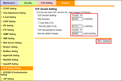 Haga clic en [Configuración de socket TCP] en el menú de la ficha [Red] para visualizar esta pantalla.