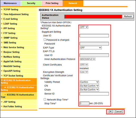 [Tiempo de parada] | Especifique el periodo de tiempo que debe transcurrir desde que se inicia el proceso de autenticación hasta que la comunicación de red se detiene. Para que lo reconozca de nuevo después de que la comunicación de red se detenga, vuelva a activar el interruptor principal de esta máquina después de desactivarlo. |