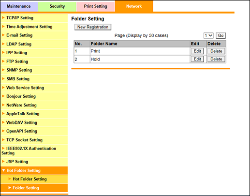 En esta pantalla, podrá registrar una nueva Hot Folder y también podrá editar o eliminar los usuarios registrados.
