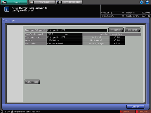 Pulse [Cerrar] para completar la configuración del papel. La pantalla vuelve a la pantalla [Máquina]. La configuración de papel especificada se visualiza en [Conf. papel] en la pantalla [Máquina].