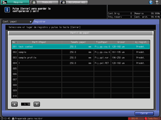 Compruebe si se ha registrado el perfil de papel en [Perfil de papel] y pulse [Cerrar].