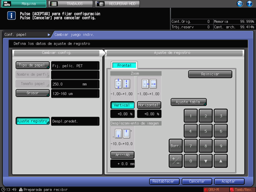 La configuración de papel registrada se visualiza en la pantalla [Máquina].