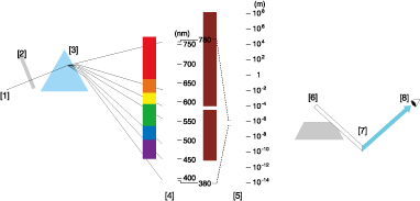 [1]: luz blanca / [2]: ranura / [3]: prisma / [4]: rayo visible / [5]: onda electromagnética / [6]: luz / [7]: reflexión / [8]: color(es)