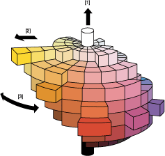 Veamos cómo identifican el color los humanos. Cuando vemos los colores de un objeto, pensamos que es rojizo o azulado, brillante u oscuro, e intenso o apagado. La sensación de lo que sentimos cuando pensamos que un objeto es "rojizo o azulado" se distingue en términos del tono. "Brillante u oscuro" se entiende como el valor de color (brillo), e "intenso o apagado" se identifica como la saturación. Estos elementos se denominan los tres atributos del color. El color liso (sistema de color Munsell) que se muestra a continuación es una expresión tridimensional de los tres atributos del color.