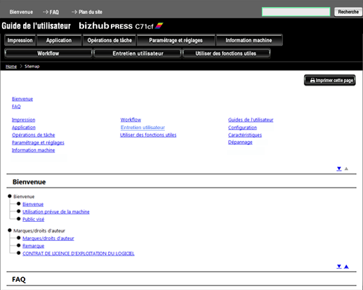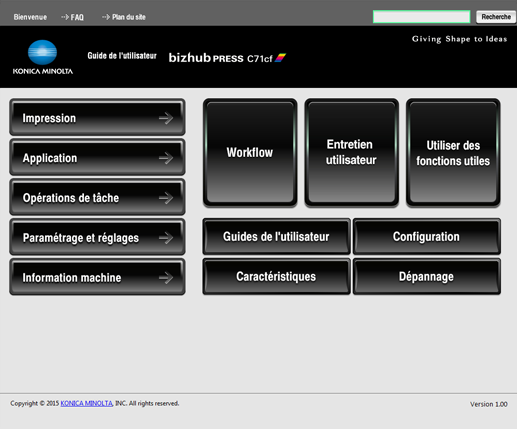 Vous pouvez rechercher des informations sur la gestion machine, par exemple les noms et fonctions de chaque composant ou sur la résolution des problèmes.