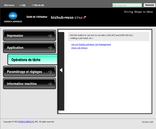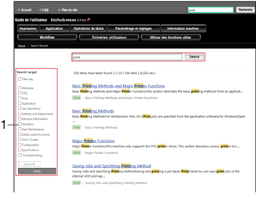 Ce champ de recherche en haut du manuel peut être utilisé pour rechercher les informations nécessaires dans le Guide de l'utilisateur. Saisissez un mot-clé dans le champ de recherche et cliquez sur [Recherche].
