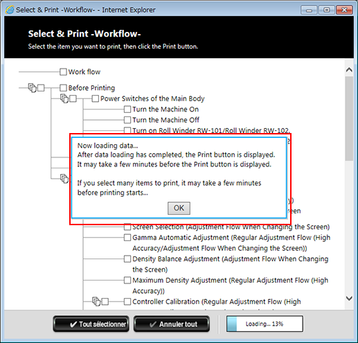 Dans certains cas le chargement de la page [Sélectionner et imprimer] met du temps à s'afficher. Si cela se produit, une fois que vous avez vérifié le contenu de la fenêtre, cliquez sur [OK] et patientez pour laisser à la page le temps de se charger.