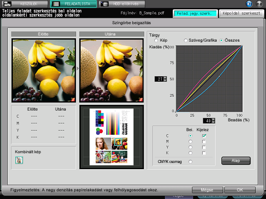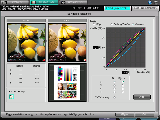 Egyenként elvégezheti a függő feladathoz kapcsolt CMYK csomag színei fényerejének és kontrasztjának beállítását, az egyek komponensek vagy a teljes csomag színgörbéin állítva. Ezenkívül az egyes külön beállíthatja az egyes objektumtípusok (kép vagy szöveg/grafika) színgörbéit.