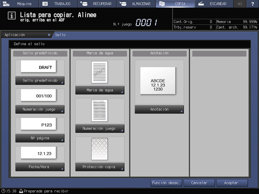 Para cancelar la función Sello con la configuración actual guardada, pulse [Función desac.].