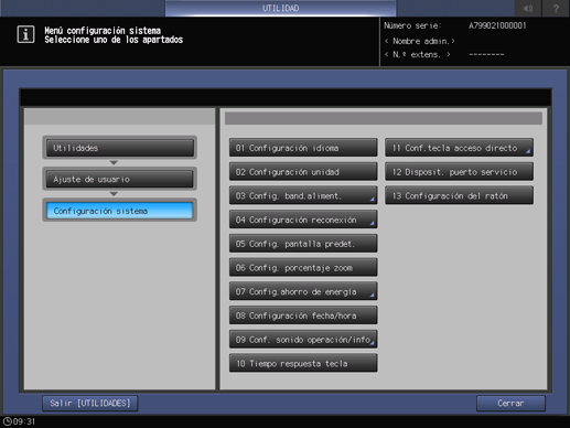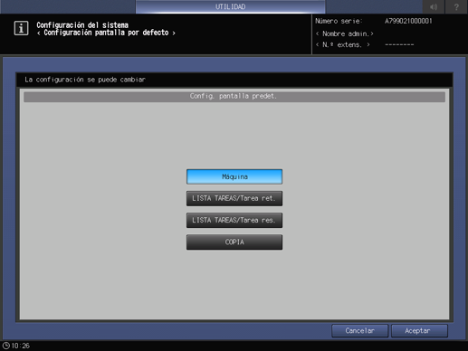 Para anular el cambio, pulse [Cancelar]. En ambos casos, la pantalla vuelve a [Menú configuración sistema].