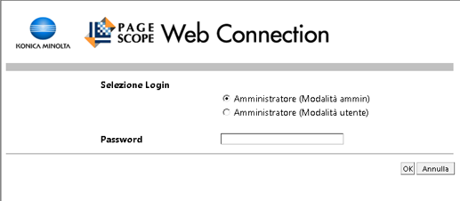L'accesso a PageScope Web Connection visualizza la schermata di login quando l'Autenticazione utente o la Traccia account è attivata e visualizza la schermata di login in modo utente pubblico quando l'Autenticazione utente o la Traccia account non è attivata . Quando si accede nuovamente alla macchina come utente o amministratore differente, uscire una volta e riaccedere.