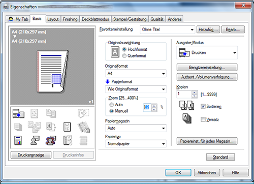 Der Druckertreiber bietet die Möglichkeit, Favoriteneinstellungen zu verwenden. Ausführliche Informationen finden Sie Hier.