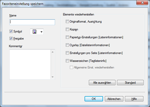Die Druckeinstellungen werden als Favoriteneinstellung registriert. Beim Start des Druckvorgangs können Sie die registrierte Einstellung aus der [Favoriteneinstellung] auswählen.