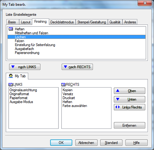 Wenn Sie auf [nach LINKS] klicken, wird die ausgewählte Funktion innerhalb von [My Tab] auf der linken Seite positioniert. Analog dazu wird die Funktion bei einem Klick auf [nach RECHTS] auf der rechten Seite von [My Tab] abgelegt.