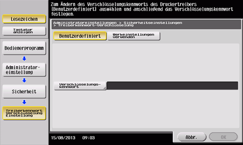 Tippen Sie auf [Bedienerprogramm] - [Administratoreinstellungen] - [Sicherheit] - [Treiberkennwort Verschlüsselungseinstellung].