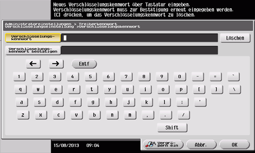 Tippen Sie auf [Verschlüsselungskennwort] und geben Sie das neue Verschlüsselungskennwort ein (max. 20 alphanumerische Zeichen, einschließlich Symbole).