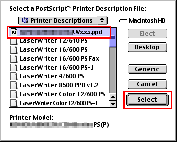 Klicken Sie zunächst auf die entsprechende PPD-Datei und klicken Sie dann auf [Select] (oder