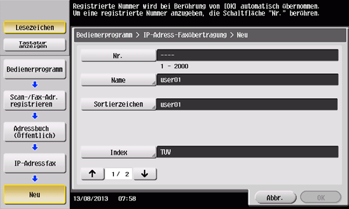Tippen Sie auf [Bedienerprogramm] - [Adresse/ Box] - [Scan-/Fax-Adresse registrieren] - [Adressbuch (Öffentlich)] - [IP-Adr. Fax] - [Neu].