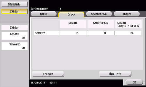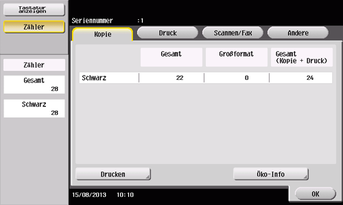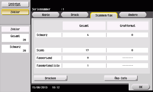 Prüfen Sie die Anzahl aller gescannten und gedruckten Vorlagenseiten, die Anzahl aller gedruckten Blätter, die Anzahl aller Seiten bei beidseitigem Druck und die Anzahl aller gedruckten Seiten unabhängig von Funktionen.