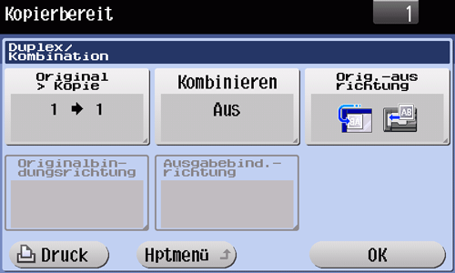 Wählen Sie eine Kombination des einzulegenden Originals (1-seitiges Original oder 2-seitiges Original) und die Kopiermethode (1-seitige Kopie oder 2-seitige Kopie). Zum Scannen eines 2-seitigen Originals geben Sie unter [Originalbindungsrichtung] an, ob das Original auf "Bindung oben" oder "Bindung links/Bindung rechts" gesetzt werden soll. Zum Erstellen einer 2-seitigen Kopie geben Sie unter [Ausgabebind.- richtung].an, ob eine Kopie auf "Bindung oben" oder "Bindung links/Bindung rechts" gesetzt werden soll. |