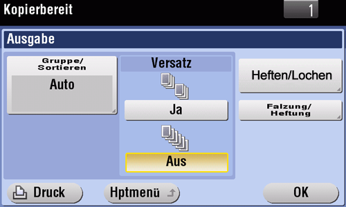 Wählen Sie [Ja], wenn die Ausgabe nach Kopien oder nach Seiten sortiert werden soll. Wenn der Finisher oder die Zweifachablage JS-506 installiert ist, werden die Kopien bei der Ausgabe übereinander gestapelt, wobei einzelne Kopien- oder Seitensätze versetzt abgelegt werden, um sie voneinander zu trennen. Wenn kein Finisher oder keine Zweifachablage JS-506 installiert ist, werden die gedruckten Kopien kreuzweise sortiert ausgegeben, wenn die folgenden Bedingungen erfüllt sind.