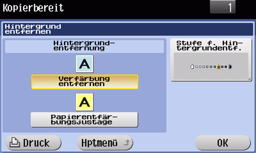 Sie können beim Kopieren von Originalen mit Farbhintergrund (Zeitung, Recycling-Papier etc.) sowie bei Originalen, die so dünn sind, dass Text oder Bilder auf der Rückseite gescannt würden, die Dichte des Hintergrunds einstellen.