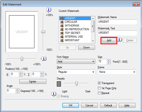 To delete a registered watermark, select the watermark from the [Current Watermark] list, and click [Delete].