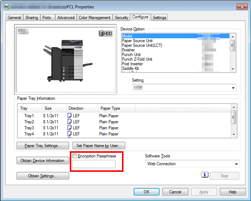 If OpenAPI communication is SSL-encrypted and the device information can be automatically obtained from the printer driver, the encrypted passphrase can be obtained from this machine. For details on how to encrypt OpenAPI communication with SSL, refer to Here.