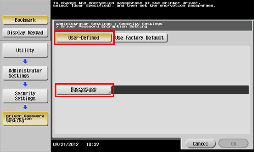Tap [Utility] - [Administrator Settings] - [Security Settings] - [Driver Password Encryption Setting].