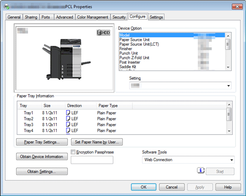 [Obtain Device Information] | The PC communicates with this machine and obtains the optional device installation information. In [Obtain Settings...], set the method of obtaining the information on this machine. | |