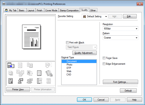 [Font Settings] (PCL/PS) | Specify how to process texts. Select a type of fonts to be downloaded from the PC to this machine. Also specify whether to replace the TrueType fonts by printer fonts when printing. If characters are garbled in an environment using the PCL driver, we recommend that you select [Bitmap] in [Download Font Format] and clear the [Use Printer Fonts] check box. |