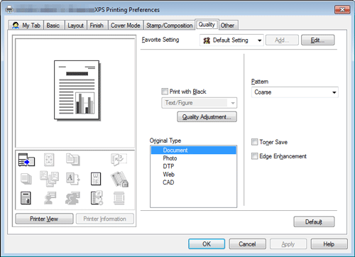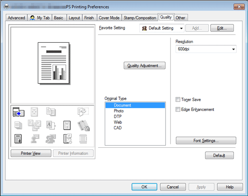 In the [Quality] tab, you can configure settings for the image quality of the original. You can specify image processing and font processing.