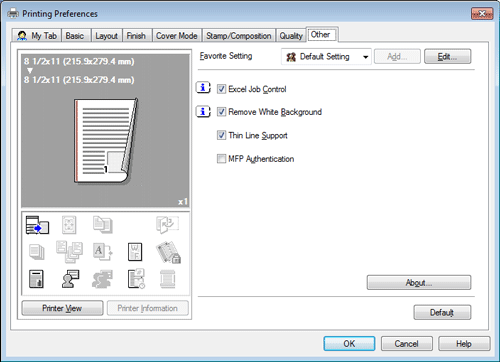 [Excel Job Control] | Select this check box to print multiple Microsoft Excel sheets with different page settings at one time. When multiple sheets with different page settings are printed at one time, the sheets may be separated into single-sheet jobs depending on the data contained. This function avoids job separation as much as possible. |