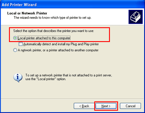 Clear the [Automatically detect and install my Plug and Play printer] check box.