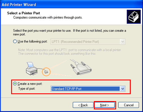 Click [Create a new port:], then select [Standard TCP/IP Port] as the [Type of port:].