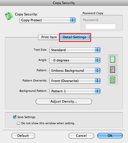 [Pattern:] | Select whether the text pattern is embossed or outlined when the original is subjected to unauthorized copying. |