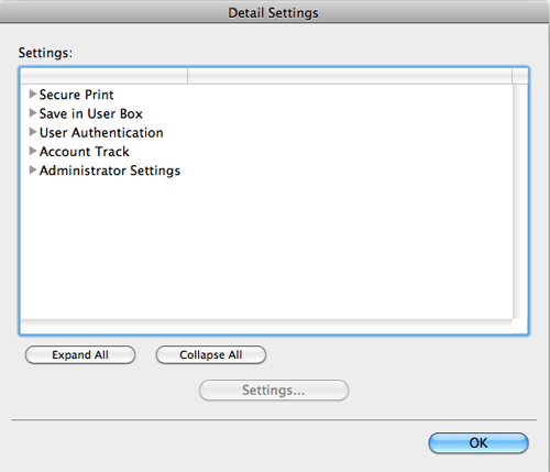 Clicking [Detail Settings...] displays the [Output Method] functions for which detail settings can be specified. Selecting a function and clicking [Settings...] displays the window for specifying the detail settings for the selected function.
