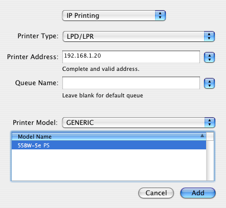 In Mac OS X 10.2/10.3, use the following procedure to add a printer with an LPR connection: